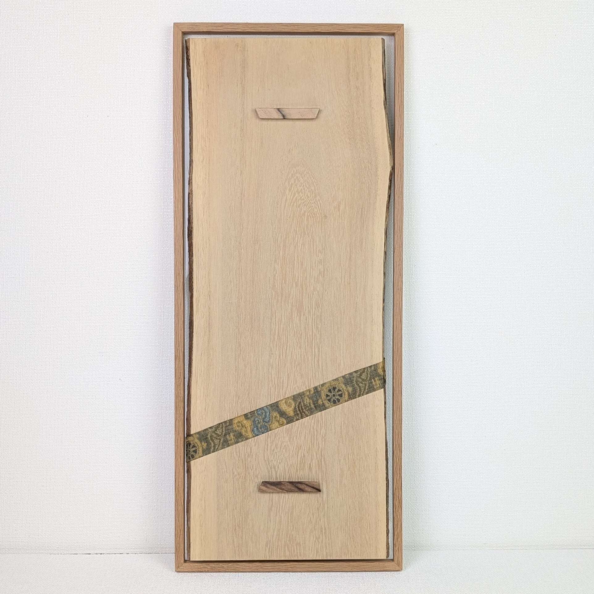 外枠は楢材、外枠と桐材のマットの間には空間を設け透明アクリル板が見える構造です。透明マットの額縁のように、この部分は壁面に掛けた時壁面が見える構造です。