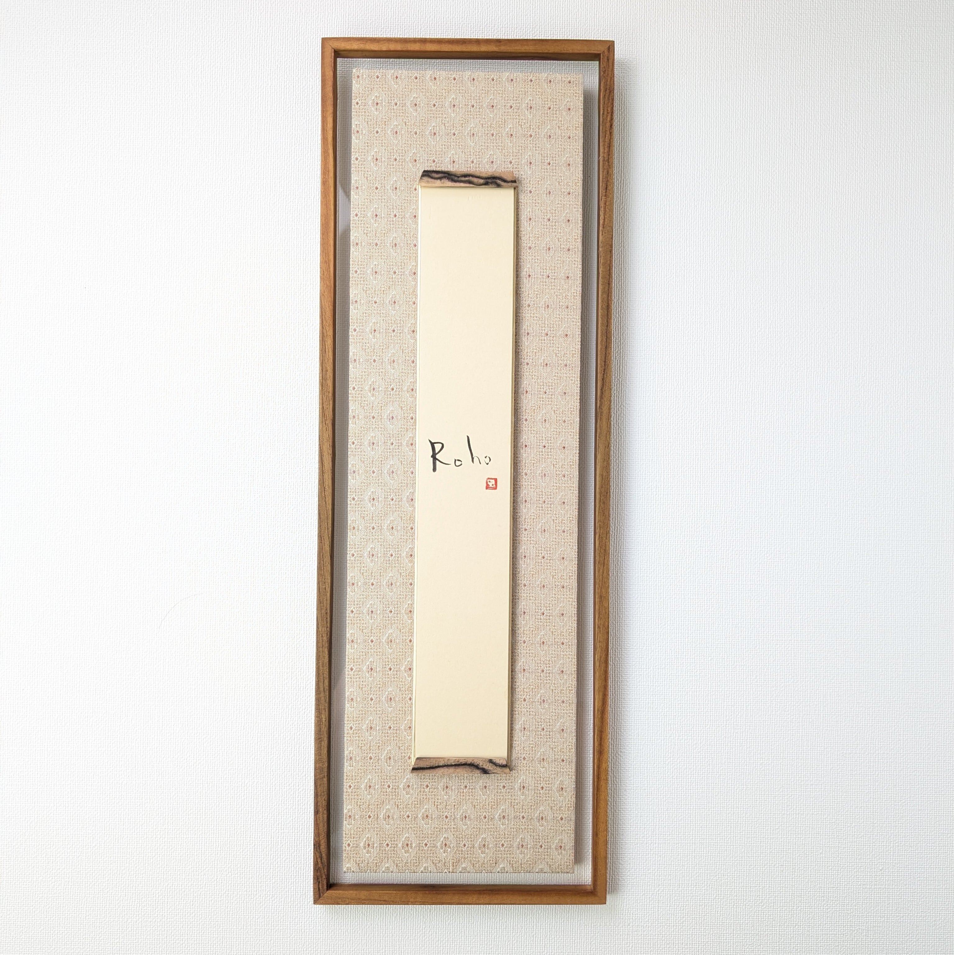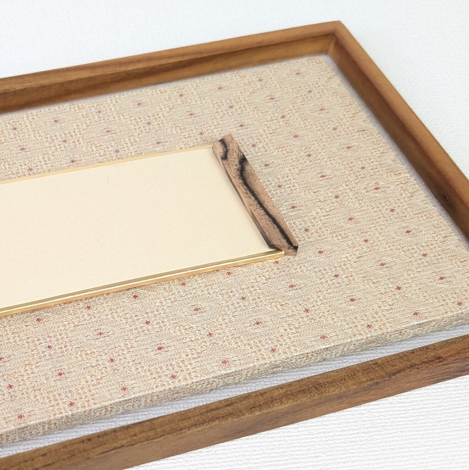 外枠にはチーク材、マット部分は草木というブランドのオシャレな表具裂地を貼った短冊掛けです。短冊は並巾、広巾どちらにも使っていただけます。
