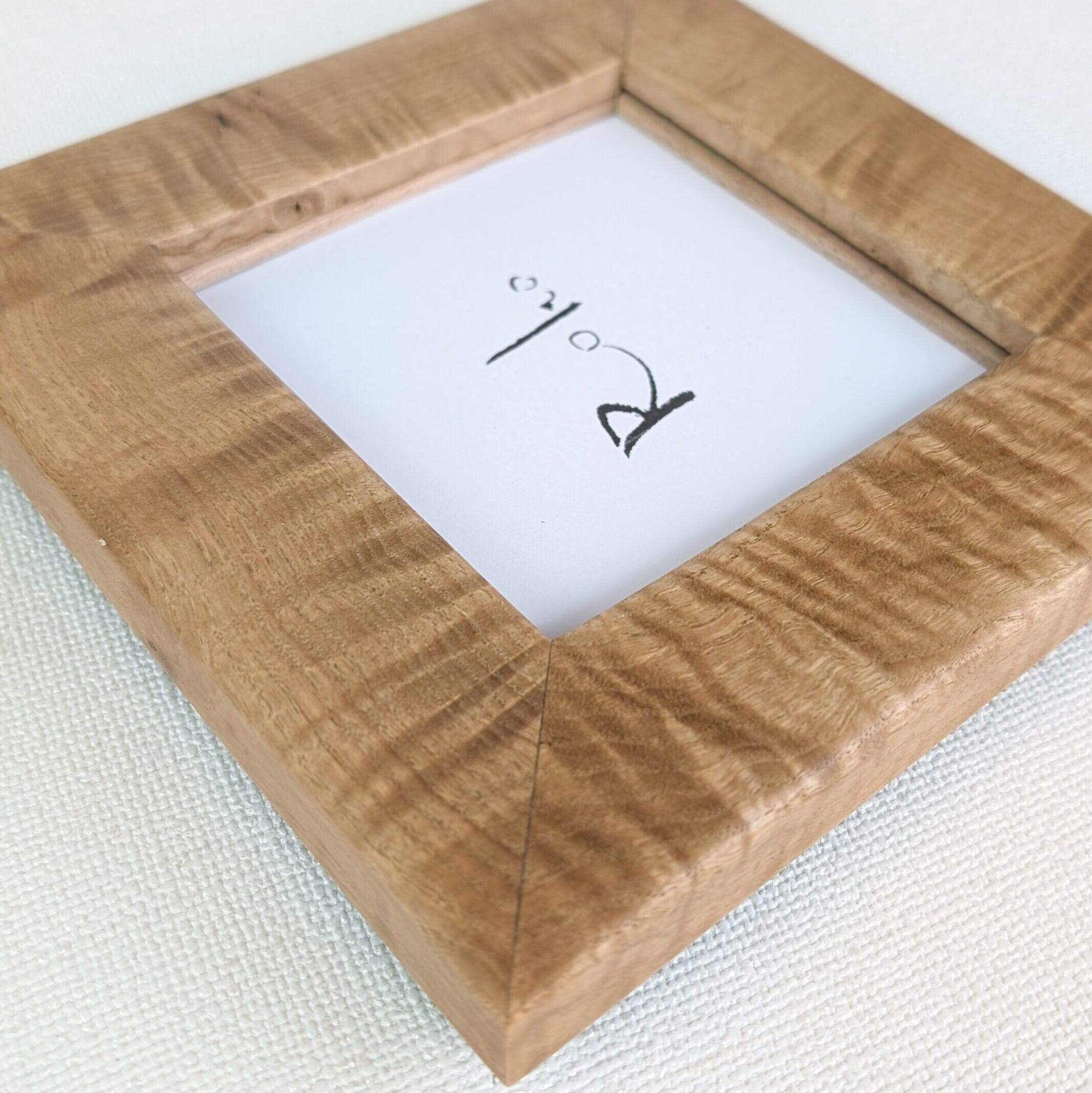 こちらの額縁は天然木、無垢の縮み杢の入ったクリ材を用いた窓寸9.5㎝角サイズ額縁です。