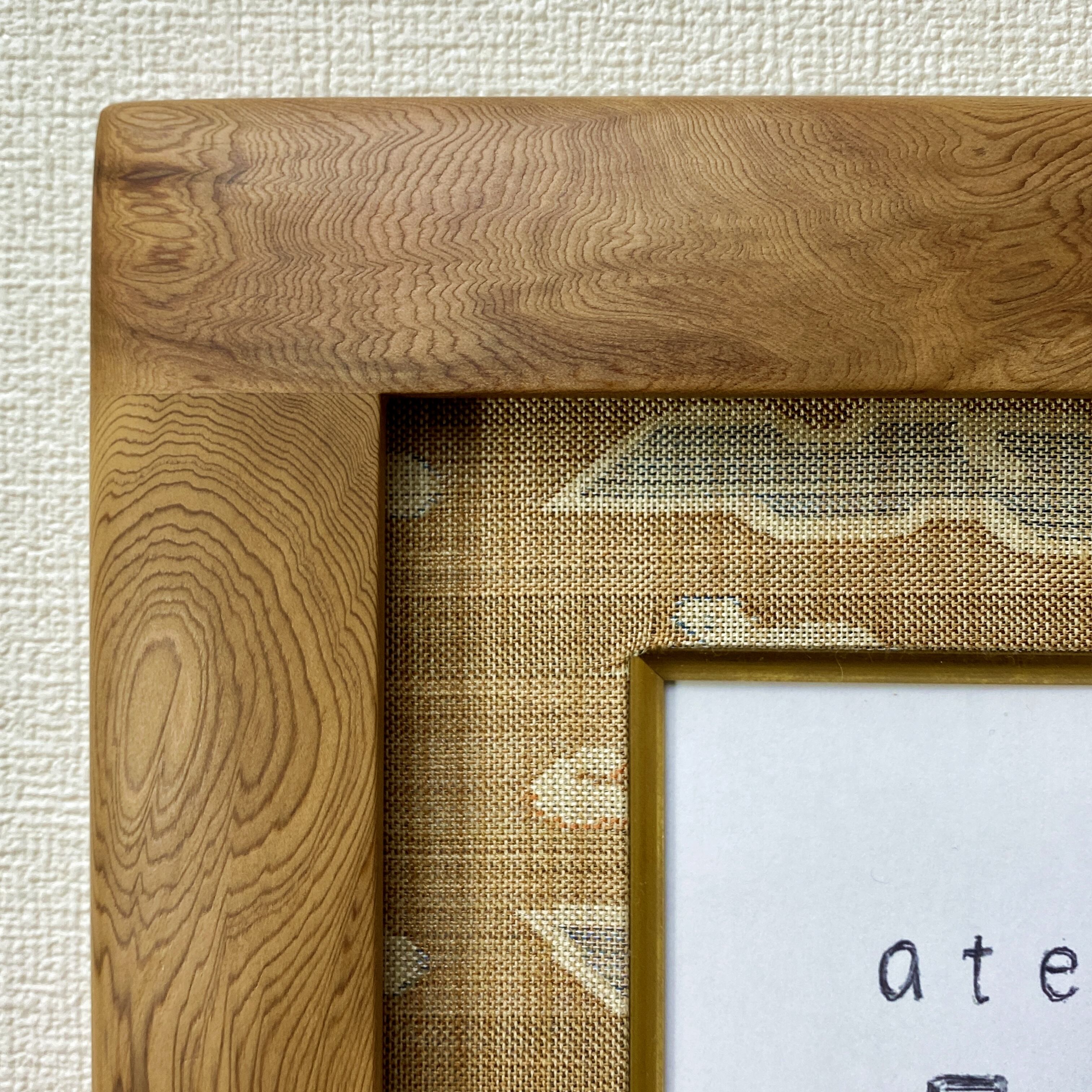 ザックリした織りの裂地で「瑞雲」の織り模様が入っておりユニークなもので、屋久杉の枠とこの裂地の組み合わせで民芸調の重量感のある額縁となっております。